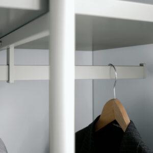 Le coppie di profili verticali, ripiani e barre appendiabiti sono personalizzabili al centimetro, permettendo di creare uno spazio su misura con precisione e senza costi aggiuntivi per riduzioni. Il sistema di ancoraggio a “pinza” tra ripiani e profili verticali offre la massima flessibilità nella posizione orizzontale e verticale dei componenti durante la progettazione. Inoltre, c’è anche una versione di barra appendiabiti posizionata in modo terminale che consente la regolazione orizzontale delle coppie di profili verticali in qualsiasi momento.