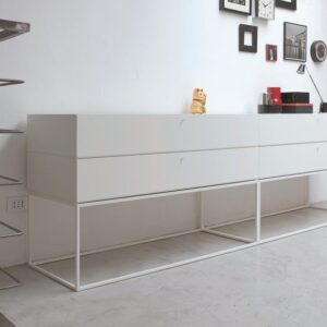 Una sottile struttura metallica supporta semplici ripiani o una torre di cassetti sovrapposti. Ampia la possibilità di giocare con nuance a contrasto od in tinta unita. I cassetti hanno struttura in Solid Surface e frontale con una perfetta lavorazione a 45 gradi.