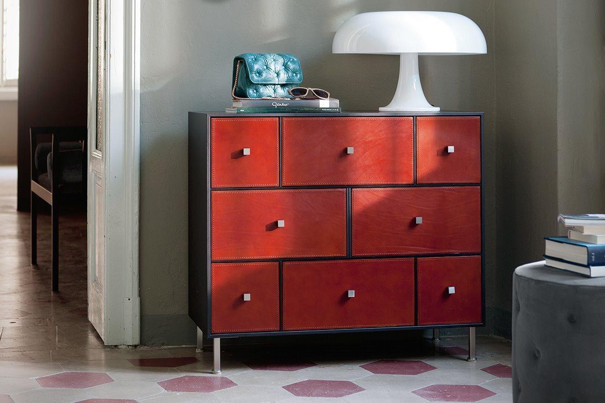 Per chi cerca un contenitore in noce caratterizzata da un design dal sapore retrò ed al tempo stesso minimal, la Cassettiera Ruccellai Porada costituisce un’ opzione molto interessante. La Ruccellai è realizzata in noce canaletta, con frontali rivestiti in cuoio pieno fiore o – se si preferisce – in legno. Nonostante le linee molto leggere il mobile è caratterizzato da una robustezza – garantita dai materiali utilizzati – che lo rendono molto affidabile e duraturo nel tempo.