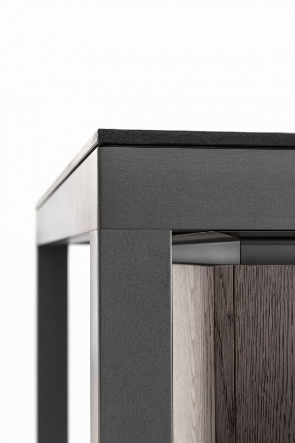 Una solida estrusione di alluminio sostiene la sottile linea del piano lavoro che definisce l’orizzonte dei volumi. La struttura rimane aerea, sospesa, e si completa con le basi a terra. La struttura a isola sostiene i contenitori sotto-Banco. Il piano ha uno spessore minimo e si adagia nella struttura in alluminio, nascondendo la sua anima massiccia.