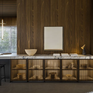 La ricerca sui materiali è sempre orientata al calore e ai caratteri mediterranei, con alternanza tra essenze raffinate come il rovere thermo, e pietre naturali sofisticate come la nuova Breccia Capraia.