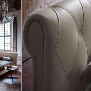 Il rivestimento in Pelle Frau® è impreziosito, sulla testata, da un moderno capitonné realizzato con delicate cuciture che tracciano grandi motivi a rombo. La parte superiore della testata termina con una piccola voluta che richiama il classico bracciolo di Poltrona Frau. Il letto Bluemoon è disponibile anche nella versione che ospita un capiente vano contenitore.
