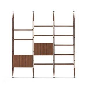 Infinito è una libreria bifacciale versatile e flessibile: la struttura portante modulare in legno massello di frassino o noce è stata concepita per facilitare il montaggio e lo smontaggio dei componenti. Grazie alla produzione seriale delle diverse parti, Cassina offre numerose soluzioni compositive a parete o come elemento divisorio. Infinito non richiede ancoraggi ed è utilizzabile su entrambe le facciate per ospitare libri o altri oggetti. I montanti regolabili sono fissati a pressione fra il pavimento e il soffitto, e un sistema di forature permette di integrare mensole e contenitori di varie altezze. Il mobile è attualmente disponibile in finiture di frassino naturale, frassino tinto nero o noce canaletto. Gli elementi per il fissaggio a terra e a parete sono realizzati in acciaio.