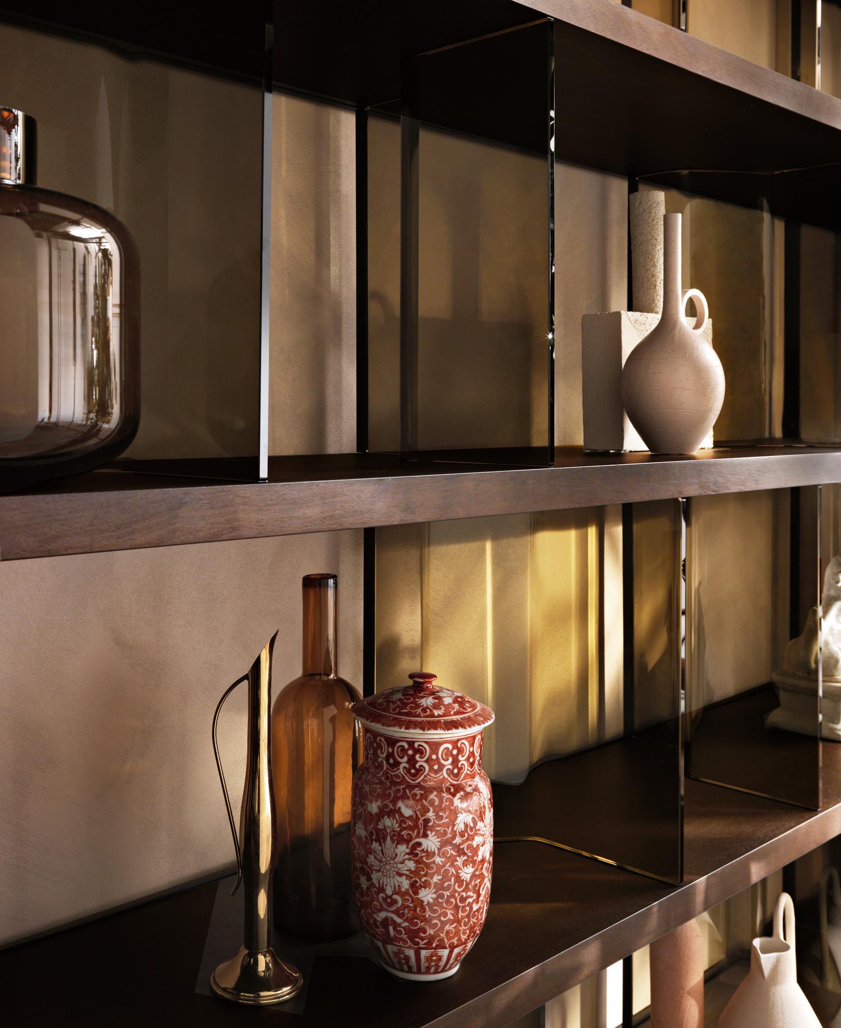 La libreria Inori è un sistema modulare composto da elementi in vetro o legno che offre grande versatilità d’uso come libreria, espositore o contenitore porta TV. La sua modularità consente una facile personalizzazione del layout, adattandosi perfettamente alle esigenze di ogni spazio. Il sistema può essere utilizzato sia in situazioni con fissaggio a muro che autoportanti. I montanti sono liberamente posizionabili grazie al sistema di ancoraggio e scorrimento a binario applicato su ogni singolo ripiano, garantendo una grande flessibilità di utilizzo. Il binario è in alluminio anodizzato nero, conferendo al sistema un aspetto moderno ed elegante.