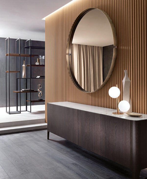Madia in rovere coke termotrattato o noce canaletto, con piano a filo in ceramica o cristallo. Ripiani interni in cristallo. Angoli smussati. Apertura con anta in battuta.