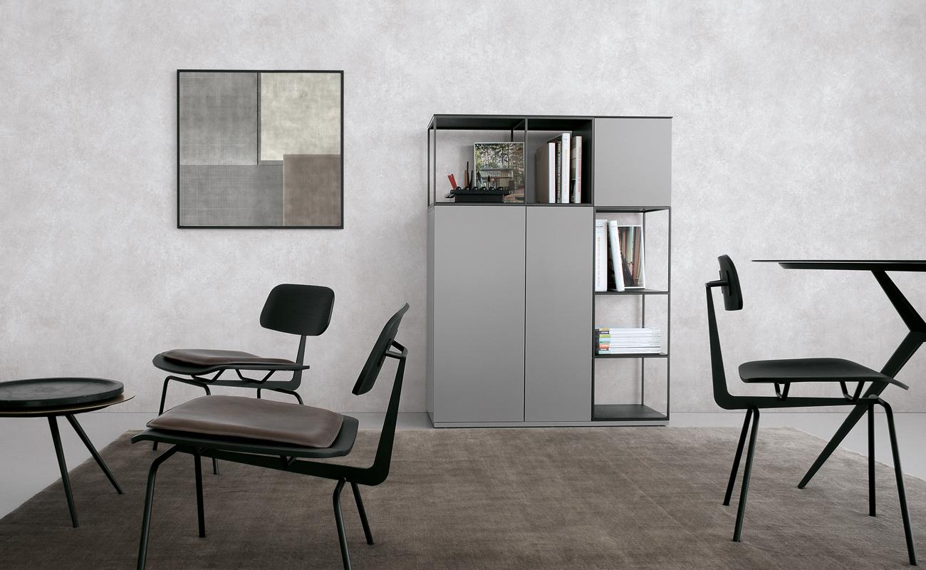 Atelier è configurabile con moduli in acciaio e contenitori in legno con diverse aperture. Sono disponibili accessori e top in HPL o marmo. Il top di 6mm unisce i moduli affiancati, rendendo l’intera composizione compatta. I ripiani interni ai moduli in acciaio sono in HPL, minimizzando l’accoppiamento con il modulo. I contenitori hanno geometrie semplici e possono avere frontali in HPL o vetro temprato. Le basi sono in multistrato laccato e includono piedini regolabili. Finiture disponibili: top e ripiani in HPL rovere affumicato, contenitori in laccato corda e telaio in acciaio verniciato bronzo.